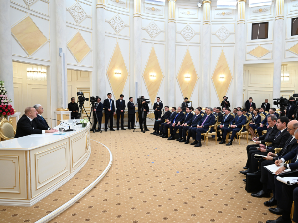 Əvvəlcə səmimi qəbula, qonaqpərvərliyə, qardaş Qazaxıstana səfərə dəvətinə görə Qazaxıstan Prezidentinə təşəkkürümü bildirmək istərdim. Qazaxıstanı mütəmadi ziyarət edirəm və Prezident Kasım-Jomart Kemeleviç Tokayevin müdrik rəhbərliyi ilə Qazaxıstanda baş verən müsbət dəyişiklikləri, inkişafı əyani şəkildə görürəm. Prezidentin modernləşdirilmə, müasir texnologiyaların, o cümlədən süni intellektin inkişafı üzrə həyata keçirdiyi islahatlar son illər Qazaxıstanın inkişaf və modernləşdirilmə yolunda inamla irəlilədiyini nümayiş etdirir.
