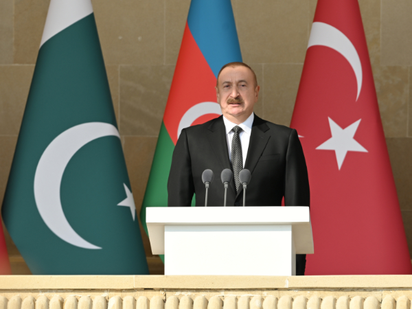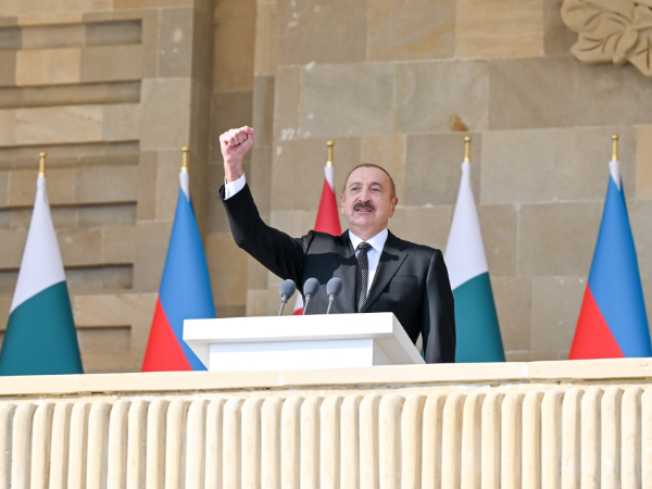 Beş il bundan əvvəl Zəfər paradında da əziz qardaşım Rəcəb Tayyib Ərdoğan bizimlə bərabər idi. Bu gün isə bizimlə bərabər digər əziz qardaşım iştirak edir. Qardaş Pakistanın Baş naziri Məhəmməd Şahbaz Şərif bizim qonağımızdır. Pakistan dövləti və xalqı 44 günlük Vətən müharibəsi zamanı Azərbaycana dəstək və həmrəylik göstərmişdir. Bu gün ilk dəfə olaraq Azadlıq meydanında Pakistan hərbçiləri də bizimlə bərabər iştirak edirlər. Bu, üç ölkənin - Azərbaycan, Türkiyə, Pakistan xalqlarının, ordularının birliyinin təzahürüdür.