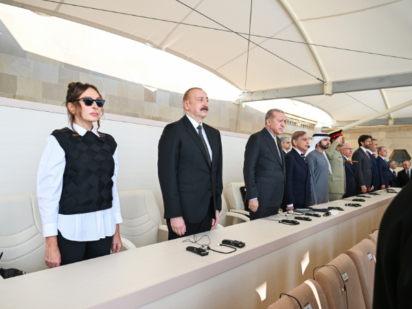 AZƏRTAC xəbər verir ki, Azərbaycan Respublikasının Prezidenti İlham Əliyev, birinci xanım Mehriban Əliyeva, Türkiyə Respublikasının Prezidenti Rəcəb Tayyib Ərdoğan, Pakistan İslam Respublikasının Baş naziri Məhəmməd Şahbaz Şərif paradda iştirak ediblər.