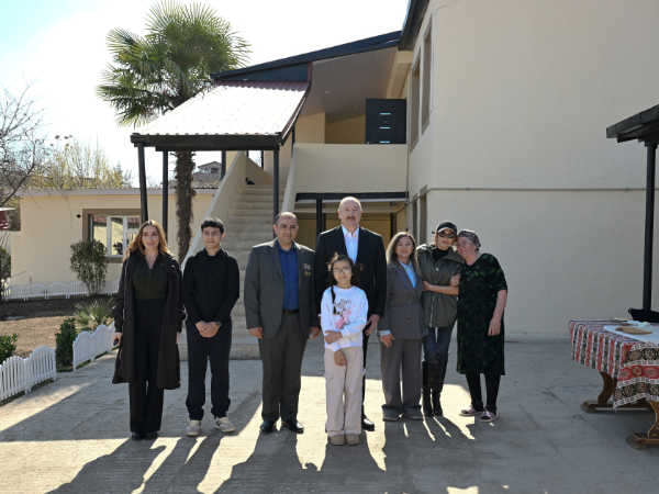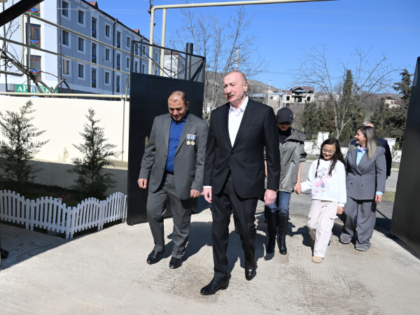 Sonra Prezident İlham Əliyev, birinci xanım Mehriban Əliyeva və qızları Arzu Əliyeva Xocavənd şəhərinə köçmüş İlqar Həsənovun evində oldular və söhbət etdilər.